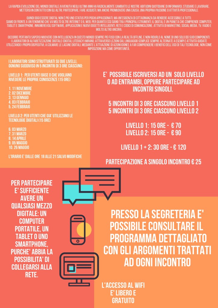 I laboratori di alfabetizzazione digitale (digital literacy) mirano, attraverso lezioni dal linguaggio semplice sempre alternate a esempi e attività guidate utilizzando i propri dispositivi, a colmare le lacune digitali, mediante l’attuazione di azioni idonee a far comprendere i benefici dell’uso di tali tecnologie, non come imposizione ma come opportunità.